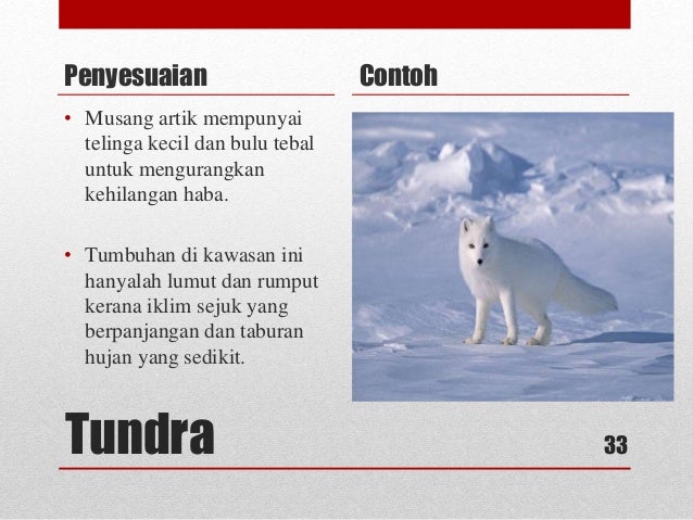 Hainama sayaAdibHari inisaya akan membentangkan TentangCara penyesuaian haiwan dan tumbuhan terhadap iklim habitat di Tundra ADD SUBTITLESains Seperti yang kita tahuTundra ialah kawasan yang mengalami musim sejuk yang lama dan musim panas yang singkatHaiwanBerhibernasiBerbulu TebalMempunyai telinga yang kecil1BermigrasiPenyesuaian Di Tundra. Tumbuhan yang tumbuh di tundra terhad kepada kepelbagaian rendah tanaman kecil yang merangkumi tanah yang disesuaikan dengan baik untuk bertahan hidup di. Pada kawasan tundra biasanya kita akan banyak menemukan lumut yang menempel pada bebatuan.