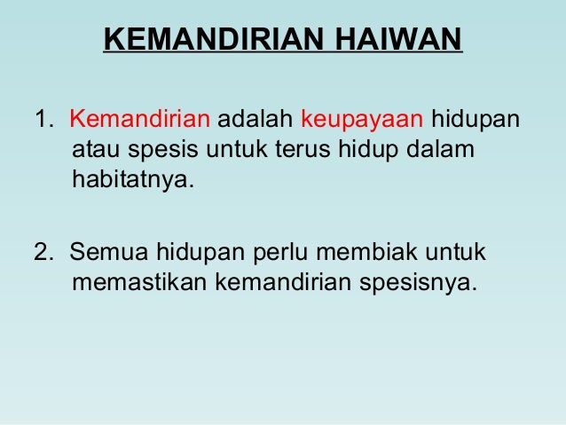 Haiwan perlu membiak untuk memastikan kemandirian spesiesnya. Kemandirian haiwanOrganisma hidup seperti haiwan dan tumbuhanperlu mengekalkan spesiesnya di alam ini Kemandirian- Keupayaan hidupan meneruskan kehidupannya bagi memastikan spesiesnya terus kekal Cara haiwan membiak. Ciri dan tingkah laku haiwan untuk melindungi diri daripada musuh.