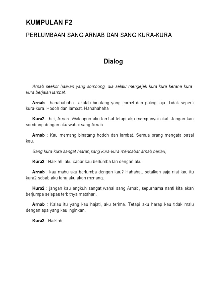 Dialog cerita haiwan. Oct 25 2015 Kumpulan Buku Islami Cerita Anak. Mar 27 2020 Olehnya itu sobat pembelajar nilai yang dapat kita ambil dalam dongeng Bebek Selalu Hidup Rukun ini adalah tentang bagaimana kita sebagai manusia juga dapat hidup rukun dilingkungan kita dan saling percaya dan mempercayai terhadap orang disekeliling kita. Apr 10 2020 Cerita Fabel Hewan Pengertian fabel menurut Kamus Besar Bahasa Indonesia adalah cerita yang menggambarkan watak dan budi manusia yang pelakunya diperankan oleh binatang berisi pendidikan moral dan budi pekerti.